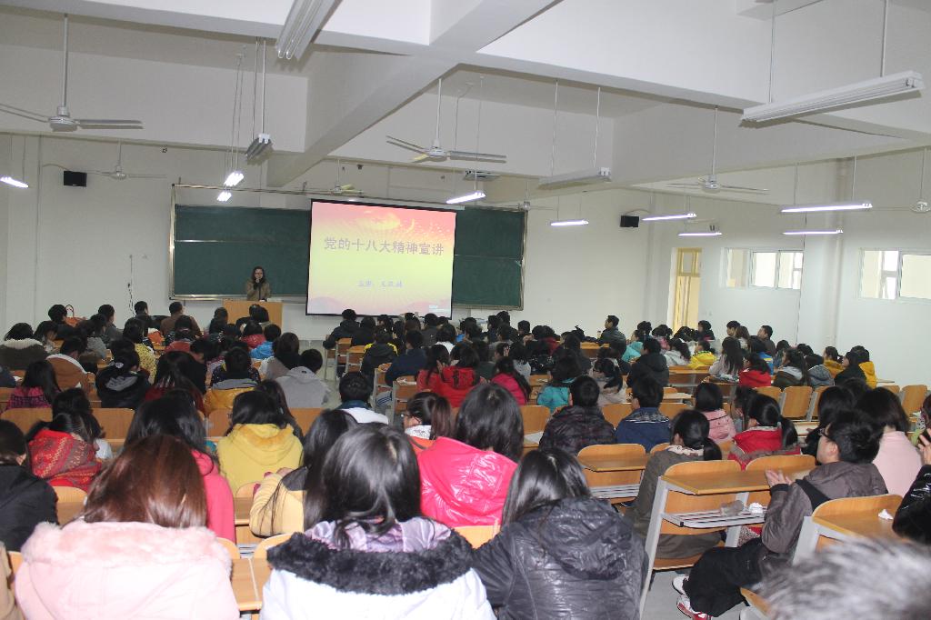 王汉琳老师系统梳理了十八大报告及会议精神实质,归纳为七个方面对十八大报告及会议精神进行了讲解:一是关于十八大的主题、主要成果。二是关于十年基本总结和科学发展观的历史地位。三是关于夺取中国特色社会主义新胜利。四是关于全面建成小康社会和全面深化改革开放。五是关于经济、政治、文化、社会和生态文明建设。六是关于重点提高党的建设科学化水平。七是关于《中国共产党章程》的修改情况。王汉琳老师结合当前老百姓关注的问题,对十八大精神作了全面、系统的解读,学习辅导深入浅出、语言朴实。通过回顾历程,总结成果,研读党的十四大以来党代会报告的主题,必须坚定中国特色社会主义道路。王汉琳老师紧密联系经管系学生专业特点,还重点分析交流了关于经济体制改革和经济社会发展等经管系学生关心的热点问题,从国内GDP、城镇收入、农民收入、陕西省情况分析,我们坚定信念,青年学生更应倡导国家富强、民主、文明、和谐,社会自由、平等、公正、法治,公民爱国、敬业、诚信、友善,积极培育社会主义核心价值观,用十八大精神激励青年学生成长成才,为全面建成小康社会目标而努力。祝愿伟大的党和祖国永远繁荣昌盛!