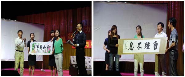 访谈结束后,杨佩将自己绣的十字绣《家和万事兴》送给了学校,并表达了自己对best365英国体育在线师生们美好的祝福。胡鸿晓代表best365官网全体师生回赠了best365官网教师为杨佩题写的“自强不息”书法作品。