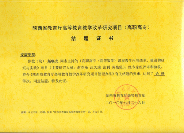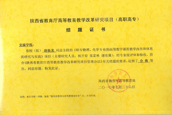 近日,陕西省教育厅高等教育处组织专家,按照《陕西省教育厅高等教育改革研究项目管理办法》,对2009年前承担的陕西省教育厅高等教育改革研究项目(高职高专)进行全面检查,best365英国体育在线赵临龙教授主持的《高职高专<高等数学>课程教学内容改革、建设的研究与实践》(2005-2008年)和《师专物理、化学专业的高等数学课程教学内容和体系的研究与实践》(1999-2002年)2个项目达到了合格等次,同意结题。