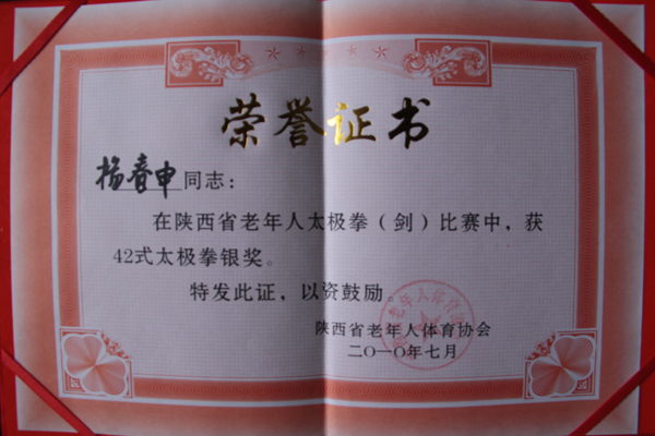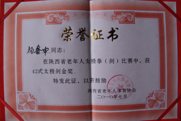 我院退休职工杨春申同志于2010年7月26日―28日参加了陕西省老年体育协会在西安市举办的“陕西省老年人太极拳(剑)比赛”,夺得42式太极剑金奖,42式太极拳银奖。