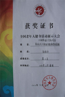 9月5日―8日杨春申同志又参加了中国老年体育协会在山东威海举办的“全国老年人健身活动展示大会”,在太极拳(剑)交流活动中,他再次获得男子各式太极剑自选或传统套路比赛第八名。