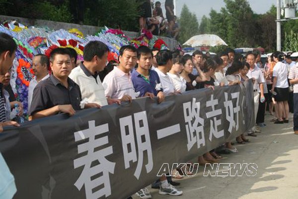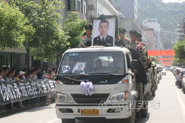 7月27日上午,中共紫阳县委、县人民政府在紫阳县殡仪馆举行隆重的追悼大会,深情缅怀罗春明同志。当英雄的灵柩在警车的引导下,缓缓穿行在紫阳县城主要街道驶往烈士陵园的路上时,万余名紫阳社会各界群众自发在街道两旁拉起:“抗洪英雄浩气长存”、“春明一路走好”的横幅,向英雄告别,为英雄送行。