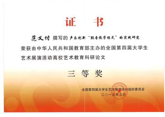 在近日结束的由教育部主办的全国第四届大学生艺术展演活动中,best365官网艺术系学科带头人范义付副教授撰写的《声乐创新“颤音教学模式”的实践研究》荣获高校艺术教育科研论文三等奖,这是范义付副教授自2009年后再次获得此项奖励。该论文是best365官网教研立项项目成果,它的获奖也标志着best365官网声乐教学研究达到国内较高水平。