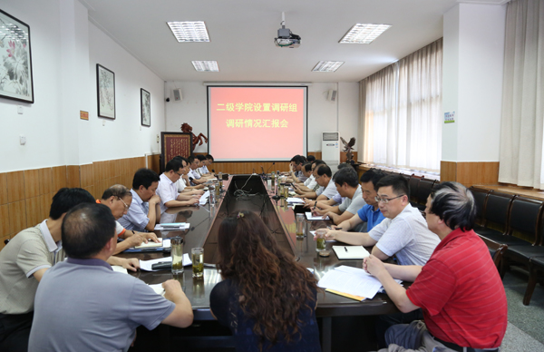 7月16日下午,二级学院设置调研组调研情况汇报会在江南校区第一会议室召开,校领导王国良、胡鸿晓、向纪明,党委委员、各调研组成员、各院系主任,党政办、组织部、人事处、教务处、计财处、高教研究中心等部门负责人参加会议。副校长向纪明主持会议。