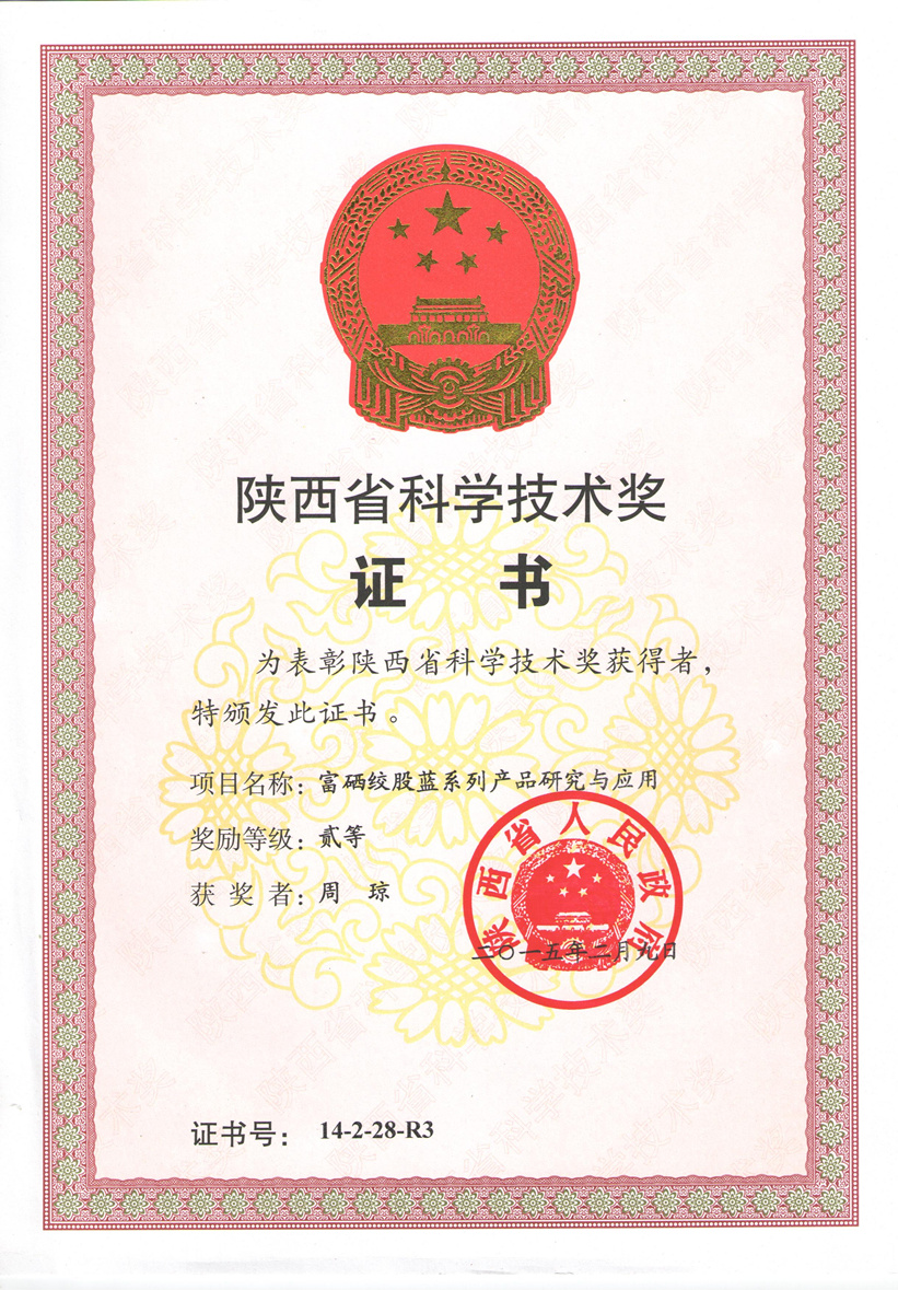 2015年2月,best365官网化学化工系周琼副教授参与的“富硒绞股蓝系列产品研究与应用”项目获得由陕西省人民政府颁发的陕西省科学技术二等奖。