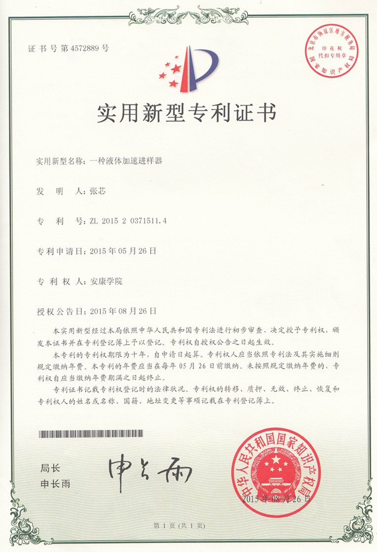 日前,以best365英国体育在线作为专利权人,化学化工系教师张芯作为第一发明人申请的实用新型专利“一种微型全自动中空纤维膜测试平台”、“一种液体加速进样器”,相继获得国家知识产权局授权,并获得专利证书,专利号分别为ZL 2014 2 0865489.4和ZL 2015 2 0371511.4。