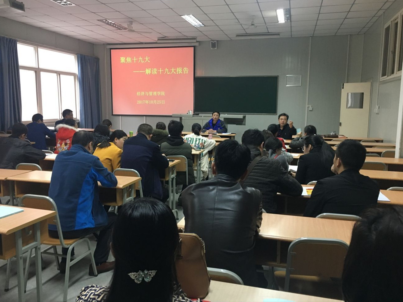 ——经管学院。10月18日上午9时,经管学院组织召集无课师生在江北校区餐厅二楼集体收看了十九大开幕式盛况。收看结束后,师生纷纷表示,习近平总书记的报告思想丰富深邃、内涵博大精深,规划了未来的愿景,描绘了未来的蓝图,令人振奋和鼓舞。我们将把思想和行动统一到十九大精神上来,在具体工作、学习中不忘初心,牢记使命,砥砺前行。10月25日下午,学院党总支在江南校区1021教室召开“聚焦十九大——解读十九大报告”专题学习会议。会议由党总支书记郑武生主持。会上,郑武生讲道,习近平总书记所作的报告气势恢宏、继往开来,是马克思主义的纲领性文献,是我们党面向未来的伟大政治宣言;报告坚持以人民为中心的发展思想,言简意赅,都是关系党和国家前途命运的关键话、都是指导工作实践的管用话、都是接地气听得懂的大实话,饱含深意,极具感染力和震撼力;报告描绘了中国未来的宏伟蓝图,使我们看到了中国未来的愿景,令人振奋、备受鼓舞。学习宣传贯彻十九大精神是当前和今后一个时期的首要政治任务,我们要在全院掀起学习宣传的热潮,把思想和行动统一到十九大精神上来。郑武生对学院今后一段时期深入学习宣传贯彻党的十九大精神进行了安排。一是中心组、党总支、党支部、团总支要带头先学,并要迅速组织支部党员、团员青年、师生员工认真学习和深入领会十九大精神实质;二是11月上旬召开中心组学习十九大精神心得体会交流会,11月30日以前,全体党员每人提交一篇1000字以上的心得体会文章;三是将学习十九大精神与提升教育教学质量、人才培养质量紧密结合,与推进学院各项工作紧密结合,与实现best365官网十三五两大战略任务(转型发展、提升层次)紧密结合,自觉用党的理论创新成果武装头脑、指导实践、推动工作,不断谱写best365官网各项事业新篇章。10月26日中午,经管学院学生第一党支部书记石晓琳在江北校区1423教室为本支部全体学生党员讲授了“不忘初心,牢记使命”学习党的十九大精神专题党课。石晓琳讲道,十九大报告紧紧围绕中华民族伟大复兴的中国梦这个宏伟目标,顺应时代潮流,回应人民向往,发出了新时代的政治宣言。作为马克思主义中国化最新成果,习近平新时代中国特色社会主义思想是实现社会主义现代化和中华民族伟大复兴中国梦的行动指南。她激励学生党员:第二个百年的奋斗目标需要你们去实现,作为新时代青年学子中的先进代表,一定要不忘初心,牢记使命,努力学习,练就本领,使自己成为德智体美全面发展的社会主义事业合格建设者和可靠接班人,中华民族伟大复兴的中国梦终将在一代代青年的接力奋斗中变为现实,希望大家在实现中华民族伟大复兴历程中建功立业,担负当代青年人的重大历史使命。党课结束后,举行了新党员入党宣誓仪式。11月1日中午,学院团总支在江北校区1421教室召开十九大精神学习会,团总支委员、各班团支部书记参加学习。会议由团总支书记段雪丰主持,郑武生参加学习并对团总支、团支部下一步的深入学习宣传贯彻十九大精神提出要求。 下午,党总支中心组在党员活动室召开了学习十九大精神心得体会交流会。与会的每位同志结合自己的学习情况和实际工作,分享了学习收获,交流了学习体会,表示要继续深入学习领悟十九大精神,把思想和行动统一到十九大精神上来,自觉用党的理论创新成果武装头脑、指导实际工作。