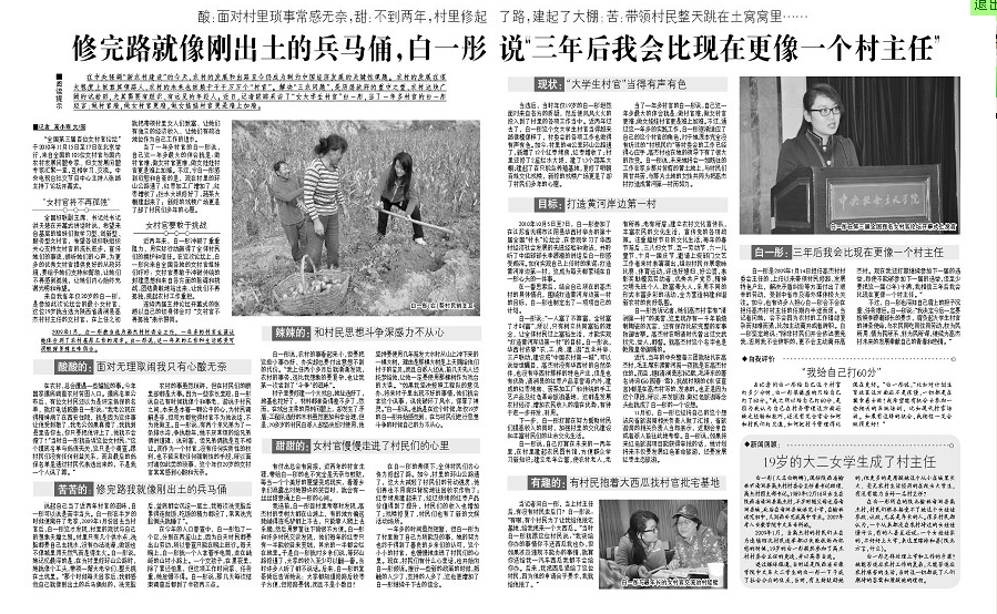 在中央强调“新农村建设”的今天,农村的发展和出路至今仍成为制约中国经济发展的关键性课题。农村的发展在很大程度上依靠其领路人,农村的未来也依赖于千千万万个“村官”。解决“三农问题”,是历届政府的重中之重,农村这块广阔的试验田,尤其需要有胆识、有远见的年轻人。近日,记者跟踪采访了“女大学生村官”白一彤,当了一年多村官的白一彤坦言:做村官难,做女村官更难,做女娃娃村官更是难上加难。