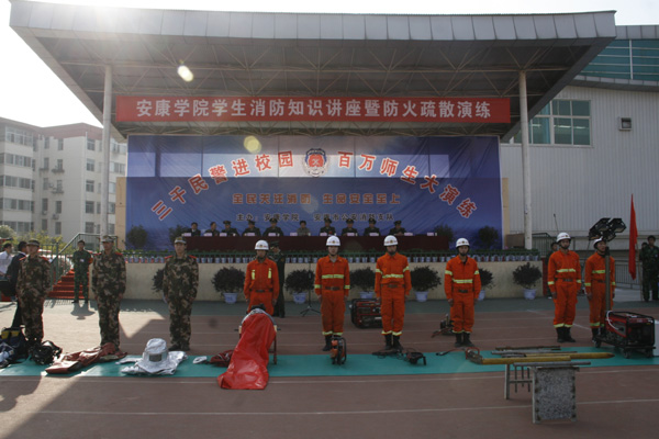 为增强广大师生消防安全意识,有效预防火灾事故发生,提高师生在突发火灾中的自我保护能力,我院围绕“全民关注消防,生命安全至上”的宣传主题,认真贯彻落实《消防法》和《高等学校消防管理规定》的精神,响应全省“三千民警进校园,百万师生大演练”的号召,在安康市消防支队的支持下积极开展消防“四个能力”建设,推进“防火墙”工程的建设。
