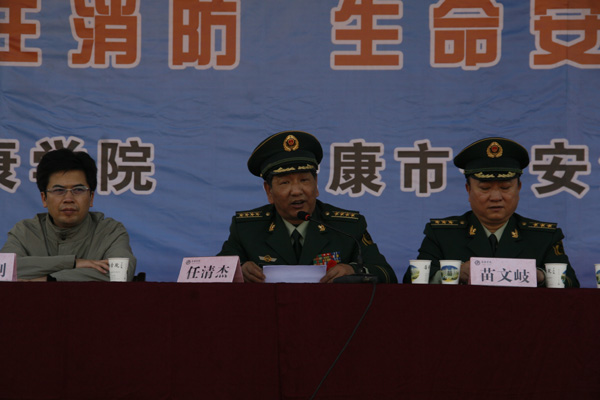 11月9日下午,我院与安康市公安消防支队在学院东校区操场联合举办消防知识讲座暨防火、灭火、疏散自救演练活动。省消防总队副总工程师任清杰、 安康市消防支队支队长苗文岐、安康市消防支队政委叶良志、best365英国体育在线副院长陈刚等领导出席了演练活动,演练活动由保卫处处长高立平主持。