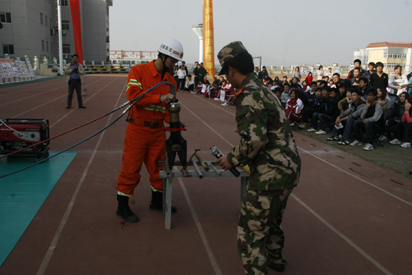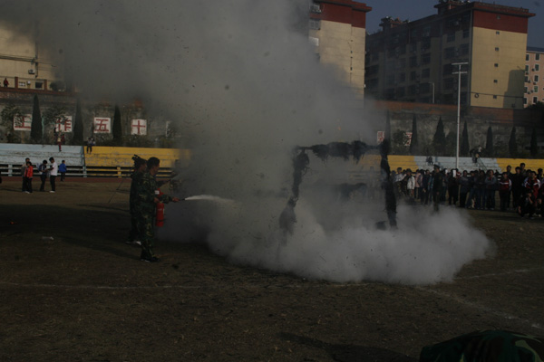 在演练活动上,副院长陈刚做了动员讲话。安康公安消防支队消防处参谋李波同志给师生详细讲解了防火、灭火、自救、逃生、疏散等方面的知识和技巧;汉滨消防中队的战士们给广大师生讲解演示了十余种消防特种器材的构造和使用方法,进行了穿越火墙表演;随后,进行了现场灭火演练,校卫队员、部分管理服务部门教工、学生代表亲自实践了灭火器的使用;60余名学生护校队员和205名新生在学生宿舍4号公寓楼参加了 “模拟火灾”疏散演练。最后,省消防总队副总工程师任清杰同志点评了本次消防演练活动,对我院的消防安全工作给与了充分的肯定,同时希望师生进一步深入学习消防法律、法规,强化消防安全意识,增强师生防火疏散逃生能力,推进平安校园建设。