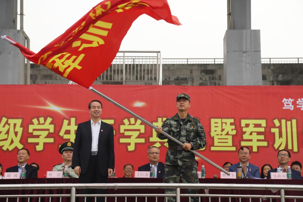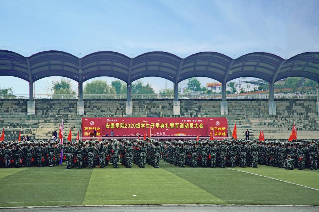 9月29日上午,best365官网2020级新生开学典礼暨军训动员大会在江北校区体育场隆重举行。学校领导班子成员,中国人民武装警察部队安康支队党委书记、政治委员杜涛上校,大队长张鹏少校,各二级学院院长、党总支书记、相关职能部门负责人等出席大会并在主席台就坐。2600余名英姿飒爽的新生与承训部队教官齐聚体育场,以庄严的开学典礼和为期两周的紧张军训,开启大学生活第一课。会上,党委书记王国良为军训团授旗,校长丁巨涛致辞,党委副书记杨行玉主持大会。