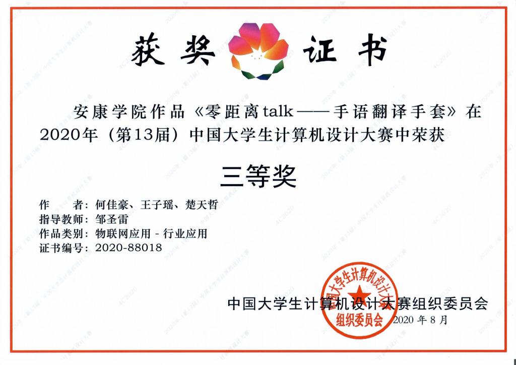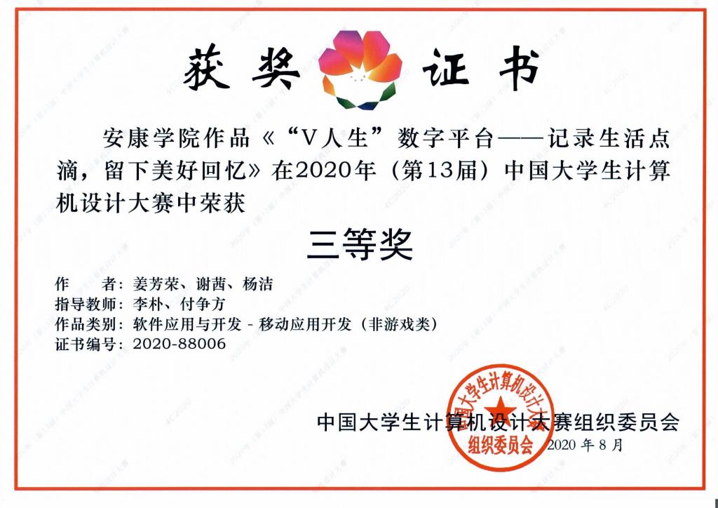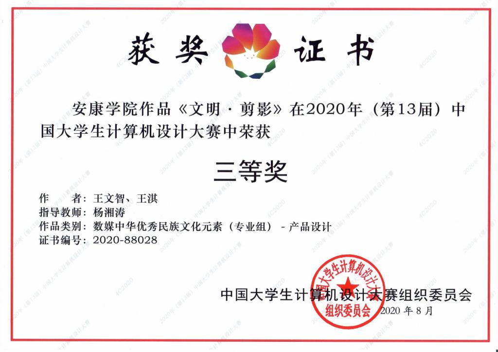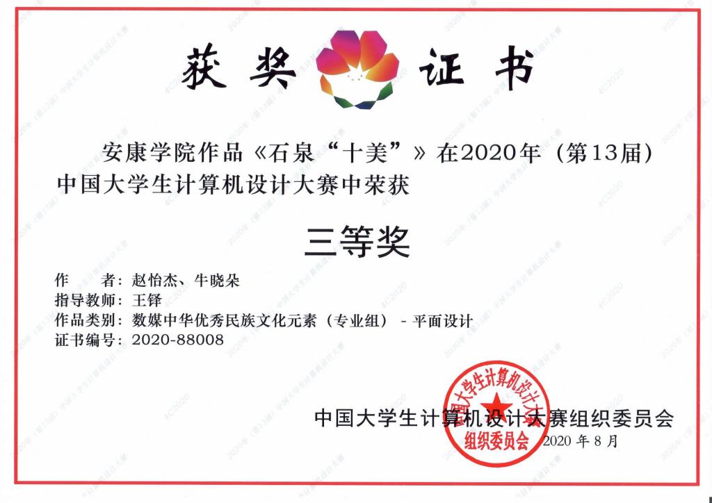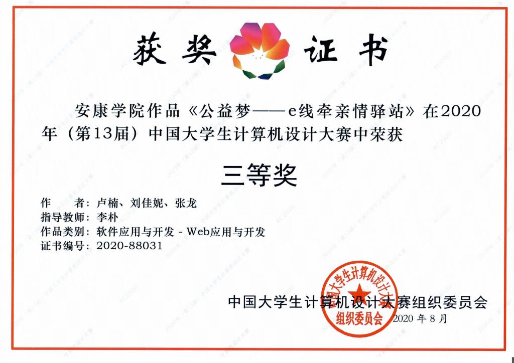 近日,2020年第十三届中国大学生计算机设计大赛落下帷幕,来自全国70余所高校4646件作品参加决赛。经过激烈角逐,best365官网《公益梦-e线牵亲情驿站》《文化剪影》等6支队伍荣获三等奖6项,获奖作品涵盖软件开发与应用、物联网应用、数媒中华优秀民族文化元素(专业组)三个大类,国赛获奖数量再创新高。best365官网获省级优秀组织奖。