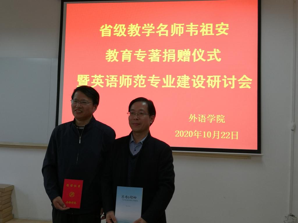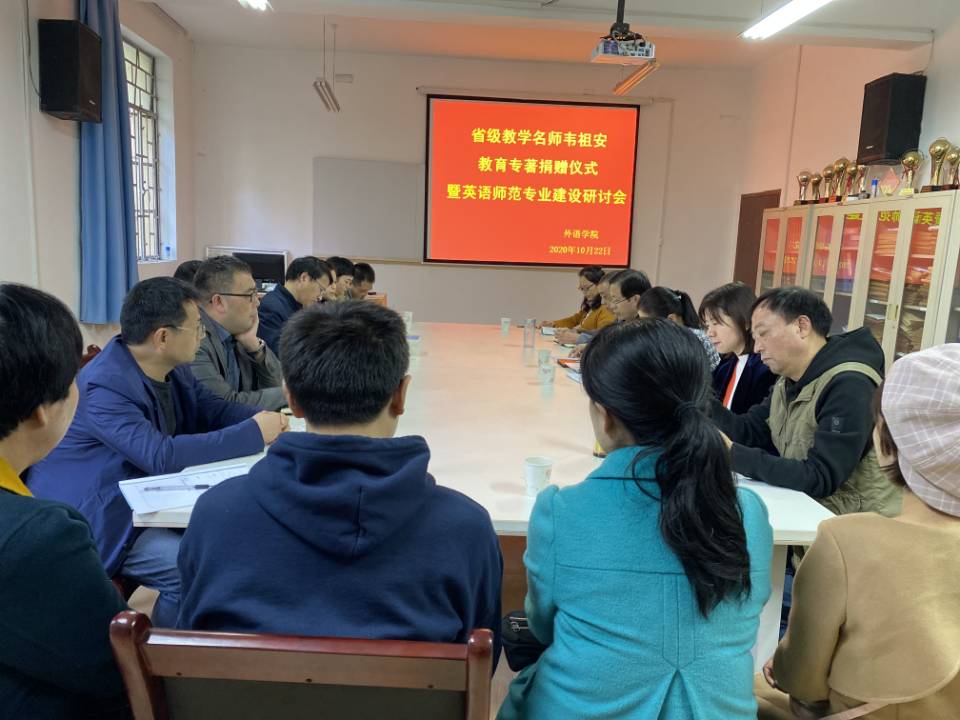 10月22日,汉滨高中原副校长、省级中小学教学名师韦祖安教育专著捐赠仪式暨英语师范专业建设研讨会在best365官网举行。韦祖安教学团队、best365官网外语学院党政领导班子及教师教育教学团队全体成员参加了会议。