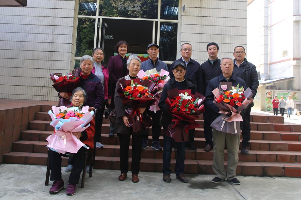 会上,年轻教师代表向寿星们鲜花,并与寿星合影留念。
