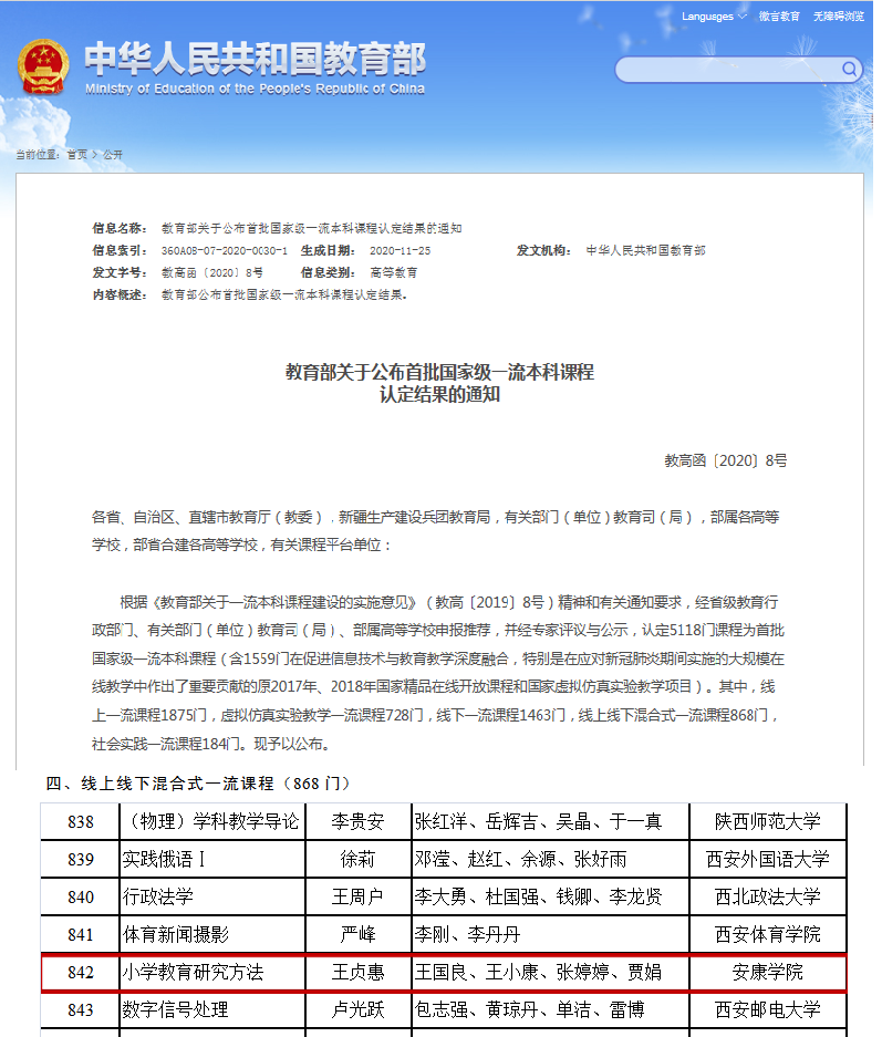 近日,教育部公布了首批国家级一流本科课程认定结果。best365官网教育学院教师王贞惠负责的《小学教育研究方法》被认定为首批国家级线上线下混合式一流本科课程,标志着best365官网在国家“双万计划”中取得重要突破。