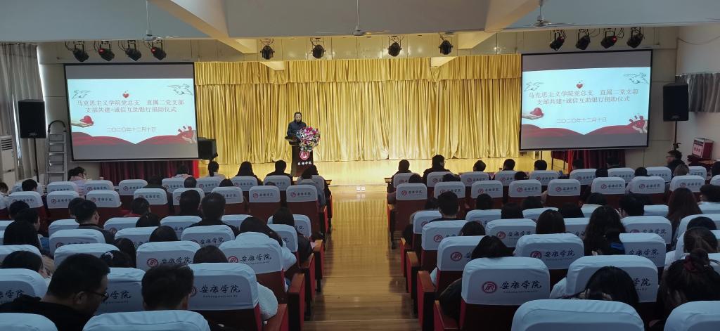 12月10日下午,马克思主义学院党总支、直属二党支部在江北1401室开展支部共建+诚信互助银行捐助活动,以结对共建“诚信互助银行”为纽带,促进工作联动,深化合作,持续推进“两学一做”学习教育常态化制度化。学校党委副书记、纪委书记、监察专员安永强,直属二党支部全体支委,民进best365英国体育在线支部副主委徐龙华及马院全体党员和各年级学生代表100余人参加了捐助仪式。