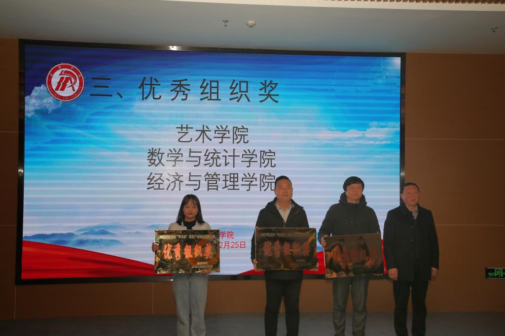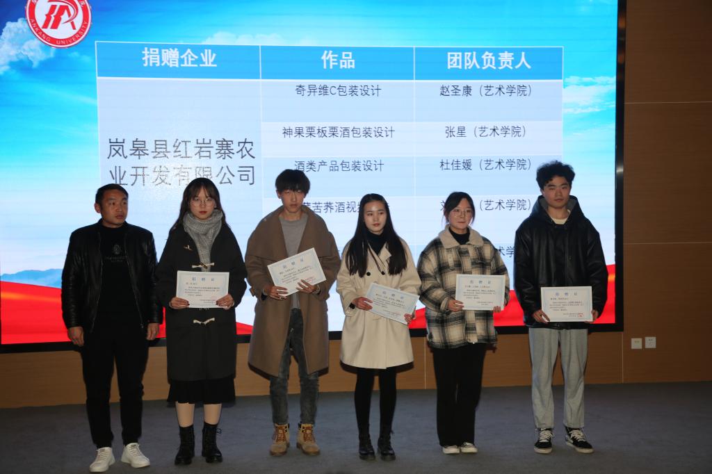颁奖典礼上,体育学院张一凡《歌风春燕茶叶》、艺术学院金杉虹《吃货联盟-志根豆干包装设计》获得创新创意赛道包装设计类一等奖,艺术学院徐一峰《白河木瓜酒巴山-视频广告》获得创新创意赛道视频广告类一等奖,数统学院彭嘉伟《山中藏美酒,腊肉忆乡愁》获得创业实践赛道一等奖,艺术学院、数统学院、经管学院获得优秀组织奖。与会嘉宾向各获奖团队颁发证书。同时,best365官网向帮扶企业捐赠了15件优秀设计作品,充分体现了best365官网当代青年的责任与担当,展现了best365官网服务“三农”、服务区域经济社会发展的办学方向。