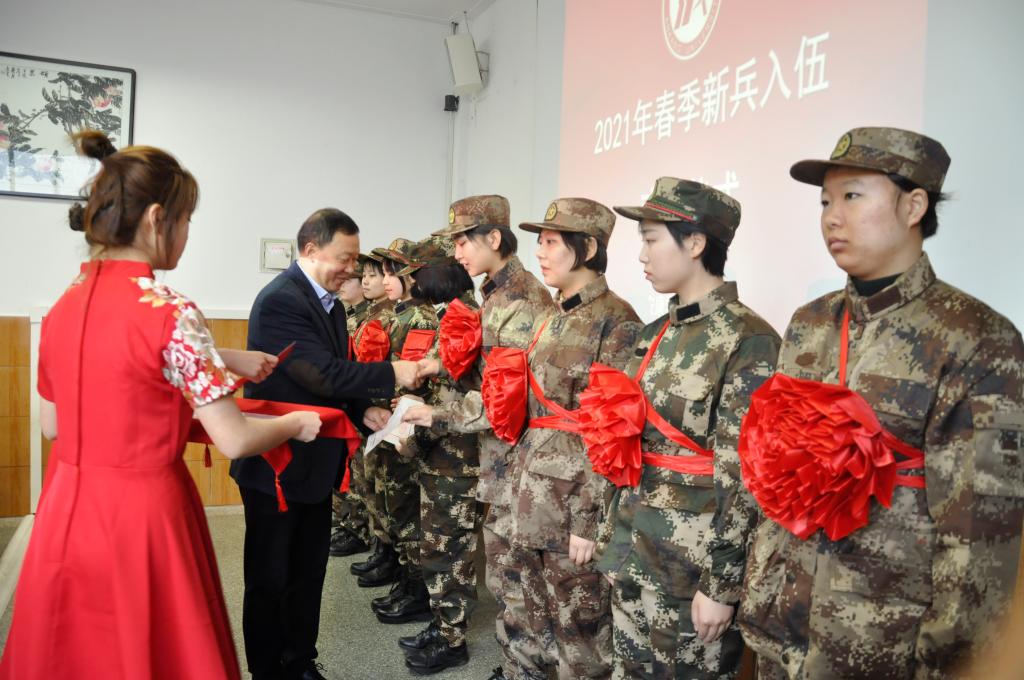 在欢送会上,胡波为入伍新兵们发放通知书。入伍新兵代表及家长代表先后发言,表达了对学校的感谢。新兵代表戴家琛表示要在部队努力训练、迎难而上、磨炼意志,为祖国立功、为学校添彩。