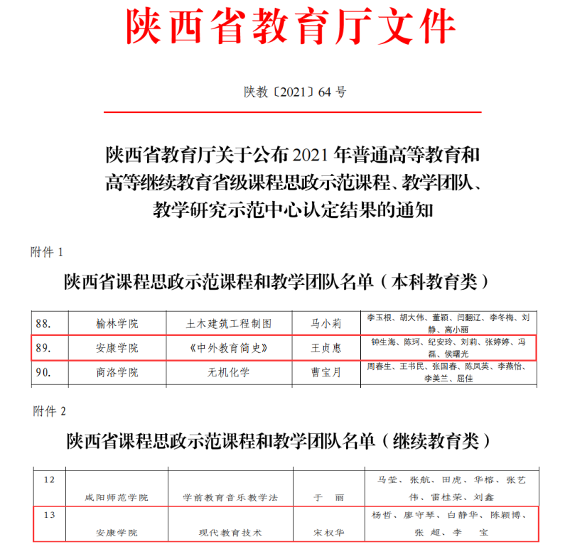 4月28日,陕西省教育厅公布了《2021年普通高等教育和高等继续教育省级课程思政示范课程、教学团队、教学研究示范中心认定结果的通知》,best365官网王贞惠副教授负责的《中外教育简史》和宋权华副教授负责的《现代教育技术》分别被认定为陕西省本科教育类课程思政示范课程和继续教育类课程思政示范课程,其教学团队被认定为省级课程思政示范教学团队。