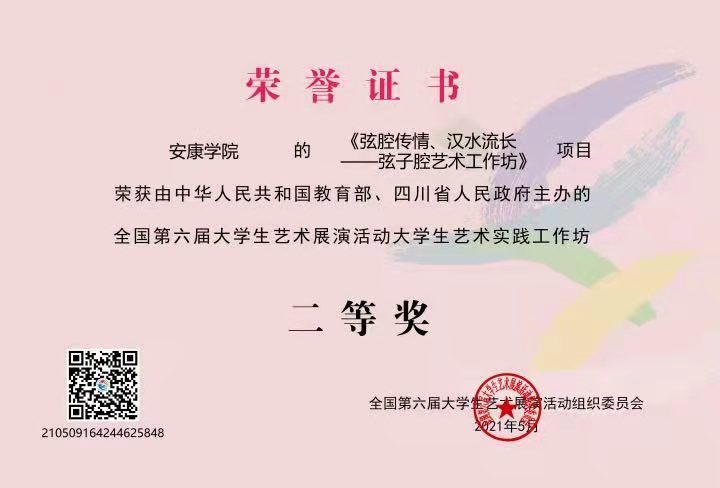 best365官网选送的由艺术学院教师鲍丽、肖剑指导的《“弦腔传情、汉水流长”——弦子腔艺术工作坊》荣获全国第六届大学生艺术展演活动大学生艺术工作坊二等奖,是best365官网近年来在此项活动获奖方面的一个突破。