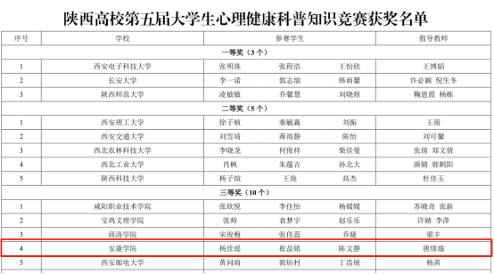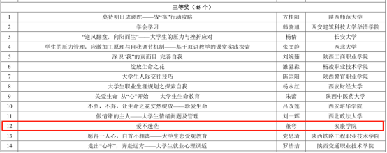 文学与传媒学院辅导员邹棠华指导的心理情景剧《寝室风波》、数学与统计学院辅导员董婷瑜指导的心理情景剧《不再坠落》荣获陕西高校第四届校园心理情景剧三等奖。《寝室风波》讲述了宿舍矛盾的产生、激化以及在有效沟通后得以化解的故事,启示学生在人际交往中要学会管控情绪,尊重他人,《不再坠落》讲述了因失恋产生敏感自卑的大学生在辅导员和同学的帮助下重拾自信的故事,旨在引导学生学会在面对消极情绪时积极寻求帮助、化解不良情绪的办法。