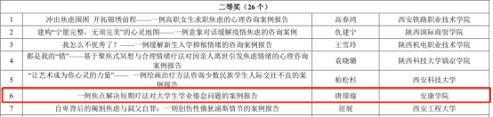 学工部心理健康教育中心专职教师唐璟瑜的咨询案例《一例焦点解决短期疗法对大学生学业倦怠问题的案例报告》荣获陕西高校第七届心理健康教育优秀咨询案例二等奖,通过焦点解决短期疗法帮助学生改善消极情绪,有效应对学业倦怠问题。
