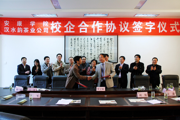 4月12日下午,我院与汉水韵茶业有限公司举行校企合作协议签字仪式,原安康市政协主席、安康市民营企业协会会长张仁莲,安康市工信局局长杨玉鹏、副局长卢浩,汉水韵茶业有限公司董事长王衍成,我院院长王兴林、副院长向纪明及科技处、团委、农生院、中文系、经管系负责人出席会议。签字仪式由安康市工信局局长杨玉鹏主持。