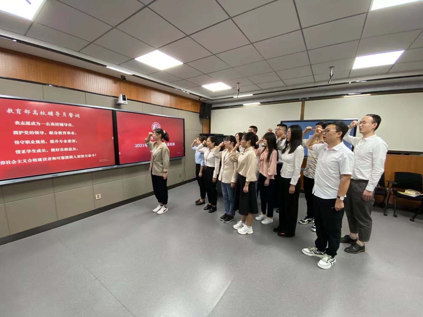培训会上,举行了庄严的辅导员宣誓仪式。新入职辅导员在赵芝老师的带领下宣读高校辅导员誓词,表达了献身教育事业,恪守职业规范,提升专业素养,情系学生成长,做好良师益友的决心和信心。