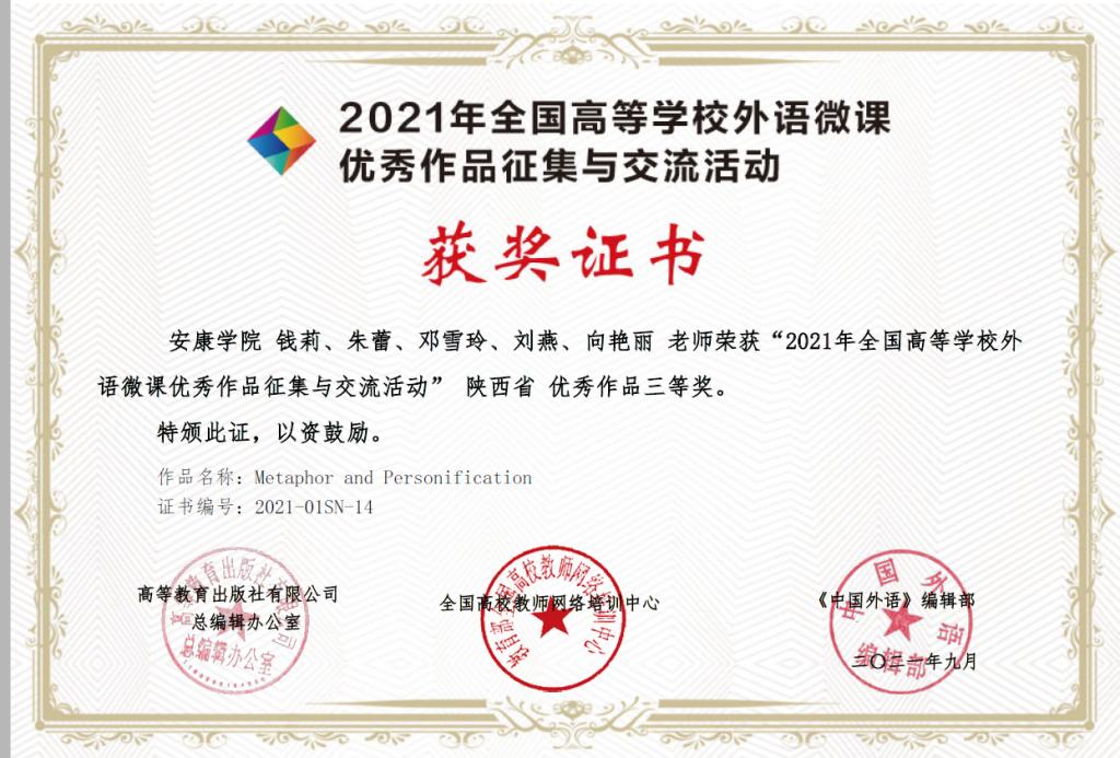 近日,由高教出版社、全国高校教师网络培训中心举办的“2021年外语微课优秀作品征集与交流活动”公布了优秀作品名单,best365官网外语学院大学英语教学团队(成员:钱莉、朱蕾、邓雪玲、刘燕、向艳丽)提交的微课作品(Metaphor and Personification)荣获陕西省优秀作品三等奖。