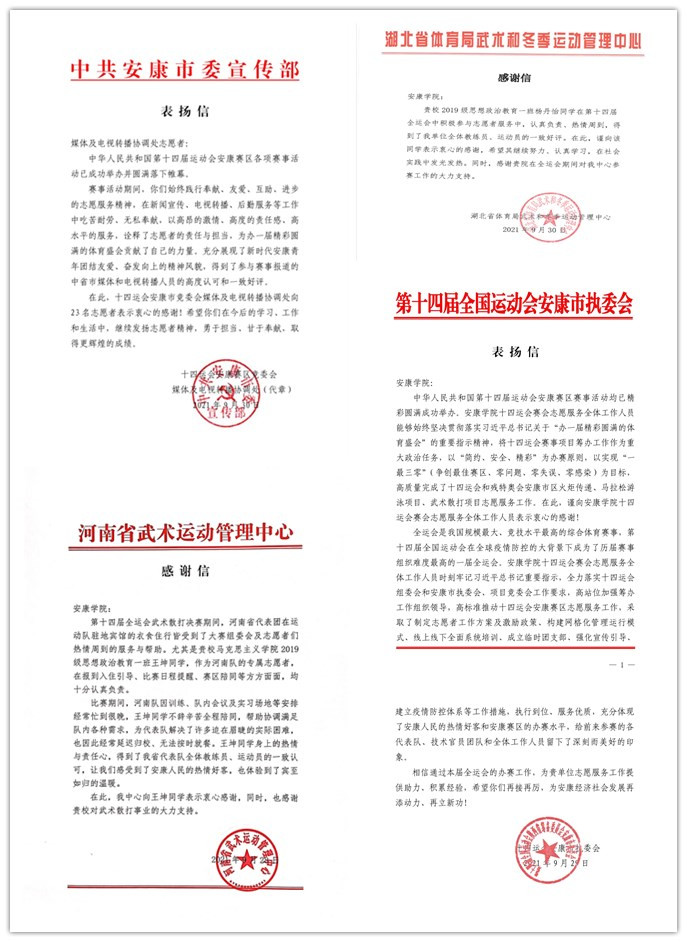 近日,中华人民共和国第十四届运动会安康赛区各项赛事活动已落下帷幕。由best365官网287名志愿者组成的赛会志愿服务团队以饱满的精神面貌、专业的业务水平和热情的服务态度为十四运会安康市区火炬传递、马拉松游泳、武术散打项目赛事全程提供志愿服务,出色圆满地完成了各项志愿服务工作,先后收到了十四运会安康市执委会、竞委会、湖北省体育局武术和冬季运动管理中心、河南省武术运动管理中心等单位发来的多封感谢信,对best365官网十四运会志愿服务工作高度赞许,对best365官网师生在全运会中的志愿服务表示感谢。