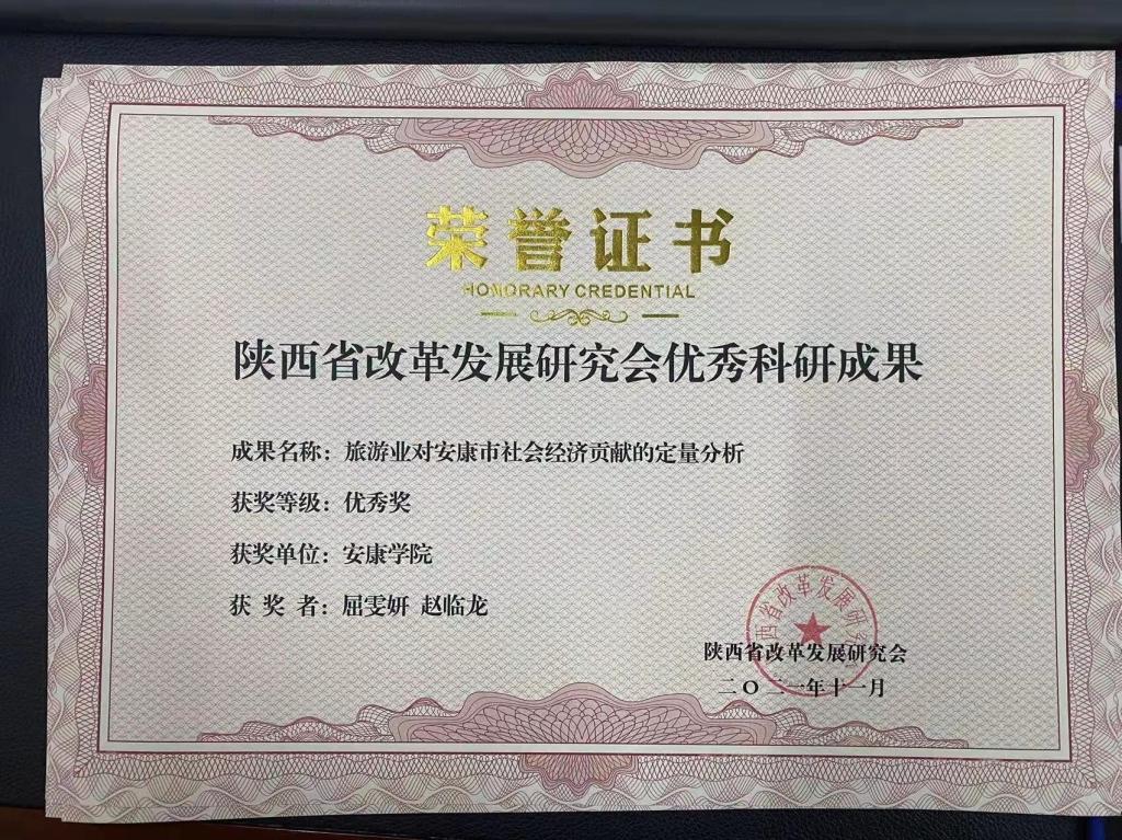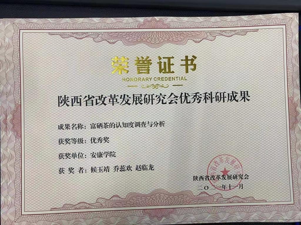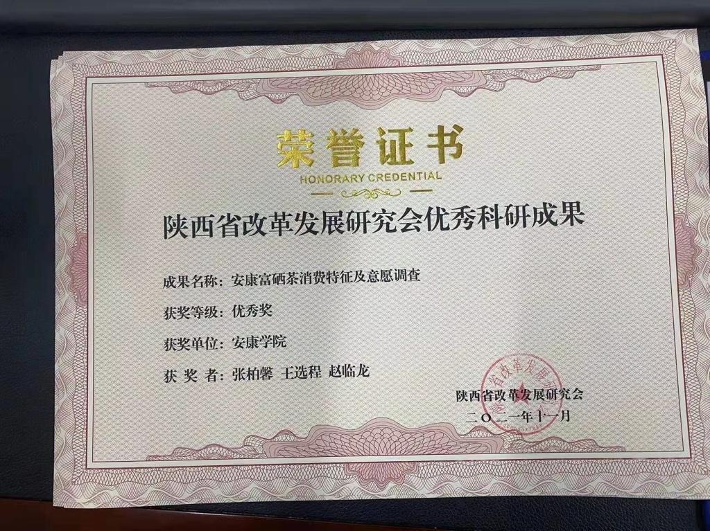 大会对陕西省改革发展研究会庆祝建党100周年优秀科研成果进行表彰,其中best365官网赵临龙教授论文《“自然国心——鸡心岭”旅游文化品牌的深度开发研究》获得特等奖,best365官网2021届数统学院统计学专业学生候玉靖、乔蕊欢在校期间本科论文《富硒茶的认知度调查与分析》,2017届数统学院学统计学专业生屈雯妍在校期间本科论文《旅游业对安康市社会经济贡献的定量分析》,2021届数统学院统计学专业学生张柏馨、王选程在校期间本科论文《安康富硒茶消费特征及意愿调查》获得优秀奖。