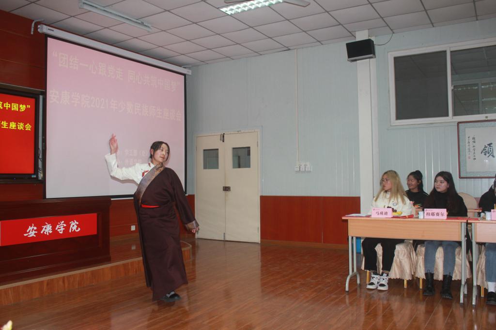 来自维吾尔族的穆耶赛尔,傈僳族的宋佳颖,回族的海文静、马丹妮,蒙古族的马瑛迪、藏族的久阿卓玛等少数民族学生代表交流了入学以来的思想、学习和生活情况,并通过PPT图文并茂地介绍了各自的民族文化和家乡的风俗习惯等,并结合脱贫攻坚、疫情防控、个人成长等实际案例,介绍了家乡及自身近年来的发展变化,充分表达了对中国共产党的感恩和民族团结的深刻认识,对祖国繁荣昌盛的美好祝愿,以及积极融入中华民族伟大复兴时代征程中的决心和信心。