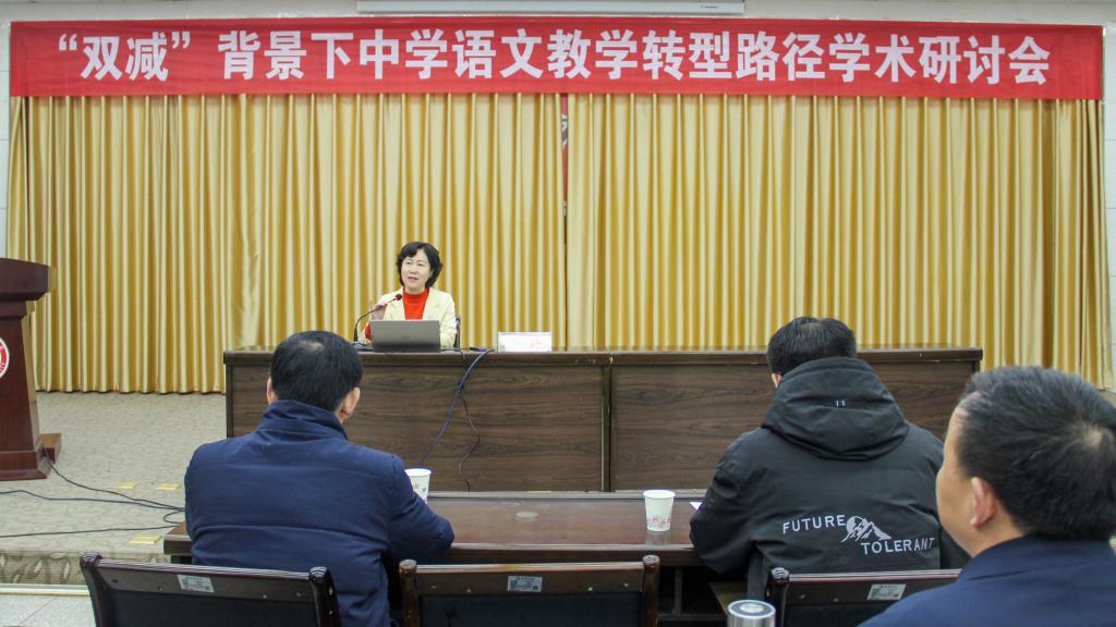 研讨会上,贾玲为本次受聘的行业导师、文传学院汉语言文学专业教师及中学语文卓越师资班学生做了“育人为本、立足课堂、减负增效”的大会专题报告。贾玲围绕“双减”背景下中学语文教学转型途径,结合生动的语文教学案例,从“用新课程理念建构有效课堂”“树立正确的课堂价值追求”“研究基于课堂标准的教学”等方面进行了分析,讲座既有国家宏观教育政策的解读,也有个人深刻的教学研究、教学体会分享,引发参会师生的共鸣与思考。
