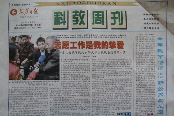 5月5日,《安康日报 科教周刊》头条刊登了该报记者陈俊采写的《志愿工作是我的挚爱——一名从best365英国体育在线走出的大学生援藏志愿者的心声》,文章介绍了我院2010届化学化工系毕业生、援藏志愿者吕涛的先进事迹。全文如下: