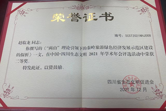 经过同行专家评议、四川省生态文明促进会第二届理事会第二次会议审定,评选出会议优秀论文23篇,其中一等奖3篇、二等奖8篇、三等奖12篇。best365官网赵临龙教授撰写的论文《“两山”理论引领下的秦岭旅游绿色经济发展示范区建设的探析》获得优秀论文二等奖。