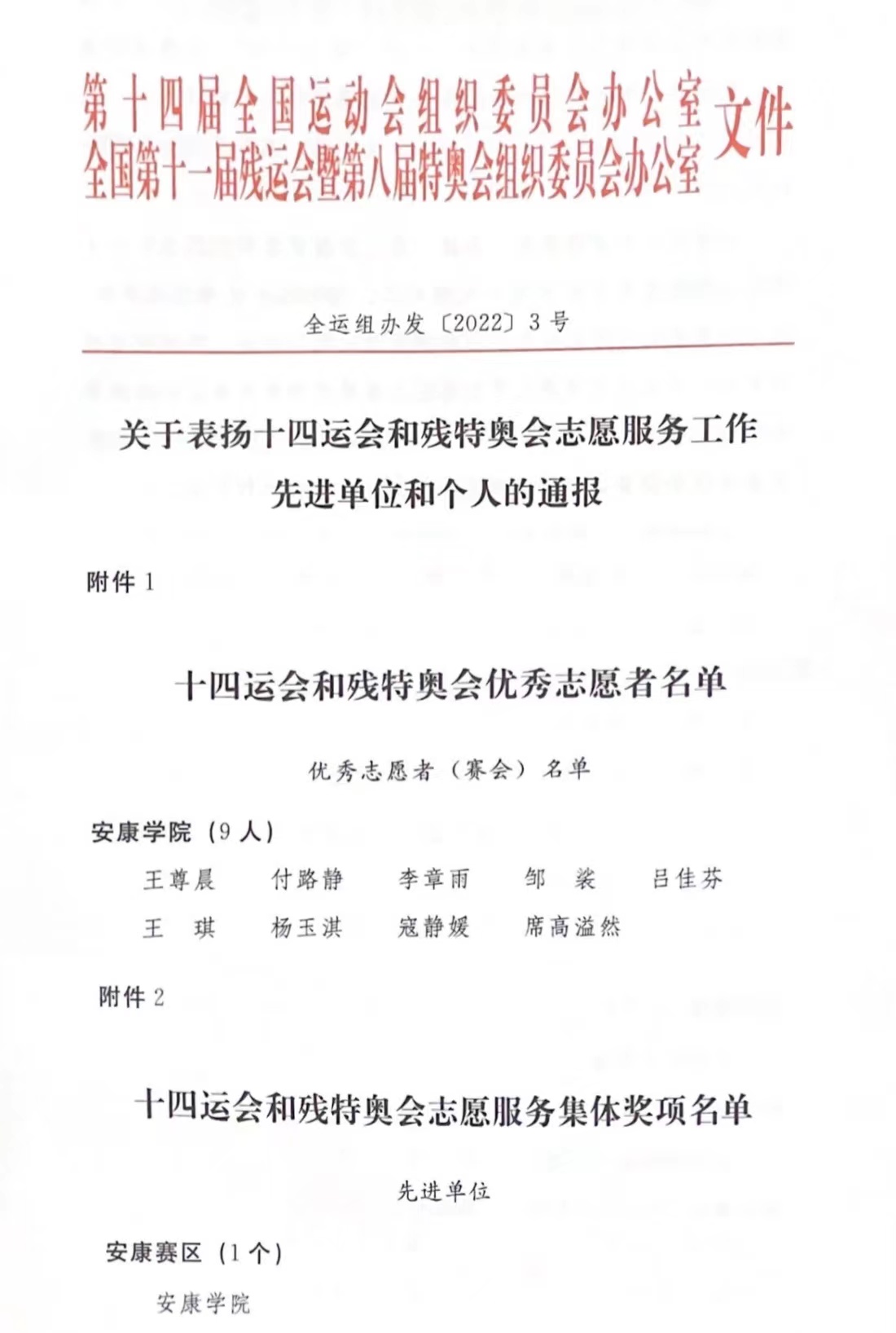 近日,第十四届全国运动会组织委员会办公室、全国第十一届残运会暨第八届特奥会组织委员会办公室联合发布了《关于表扬十四运会和残特奥会志愿服务工作先进单位和个人的通报》,best365英国体育在线获十四运会和残特奥会志愿服务先进单位荣誉称号,付路静等9名师生获十四运会和残特奥会优秀志愿者荣誉称号。