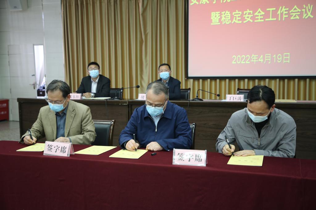 丁巨涛、钟生海分别代表学校党委和行政,与二级学院和职能部门代表签订《2022年全面从严治党工作责任书》和《2022年稳定安全工作责任书》。