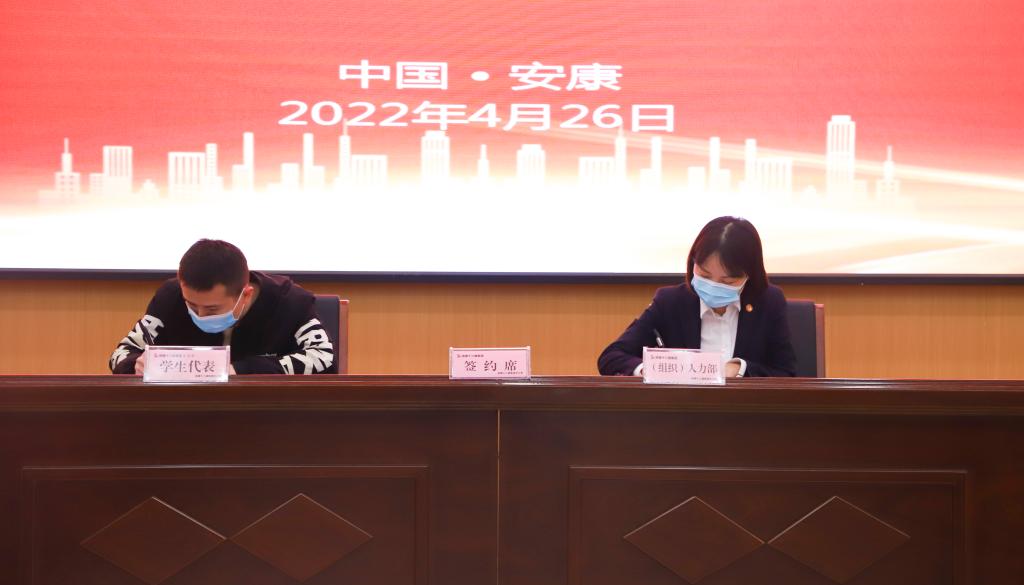 陕建十二建集团组织部部长、人力资源部经理毛婷与经管学院2022届毕业生代表李航现场签订毕业生就业协议。