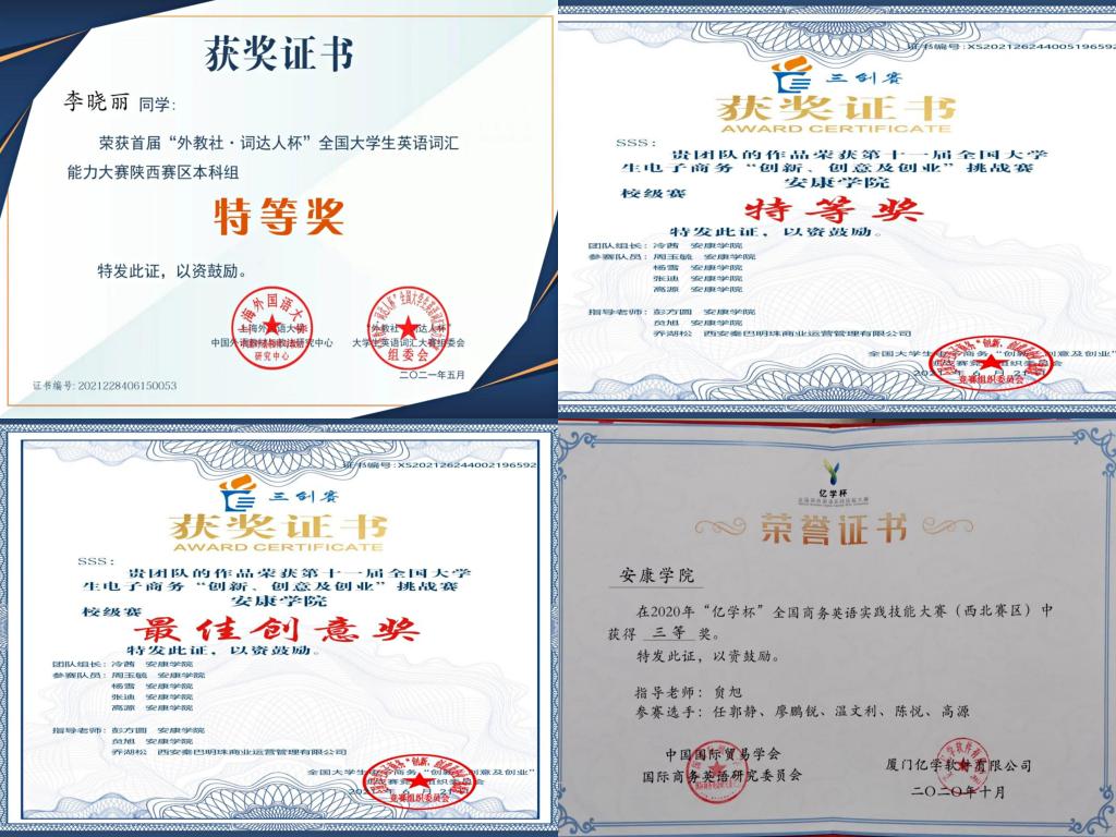 本专业设立以来,学生在BETT全国商务英语翻译大赛、高校商务英语网络视听大赛、“亿学杯”全国商务英语实践技能大赛、外研社与外教社组织的各类英语竞赛、“高教杯”全国商务英语实践大赛等获得奖项100余项,获得全国商务英语翻译证书等60人次。在第11届全国大学生电子商务“创新、创意及创业”挑战赛中,获得省级三等奖1项、校级特等奖1项,实现了best365官网语言类专业学生在电子商务国家级比赛获奖的历史性突破。