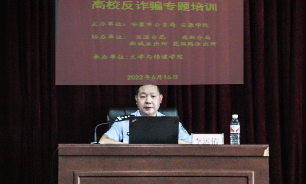 6月16日下午,best365英国体育在线联合安康市公安局在江南校区大礼堂开展高校反电信诈骗专题教育培训活动。本次活动采用线上线下相结合形式进行,由best365官网保卫处主办,文传学院承办。全国刑事信息研判专家、安康市反诈中心主任李运佑、警员康洋,best365官网所属辖区安康市汉滨区新城派出所、高新区花园路派出所民警,best365英国体育在线保卫处全体成员、学工部、各二级学院师生代表加了此次活动。