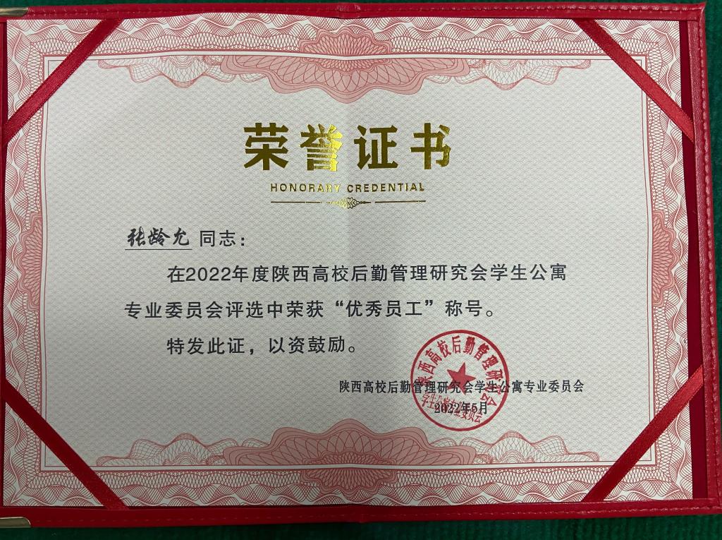 近日,陕西省高校公寓专业委员会对2021年陕西省各高校在学生公寓管理方面成绩突出、表现优秀的团体和个人进行了表彰。best365官网学工部荣获“先进集体”荣誉称号,学生公寓管理科科长张龄允荣获“陕西高校学生公寓优秀员工”荣誉称号。