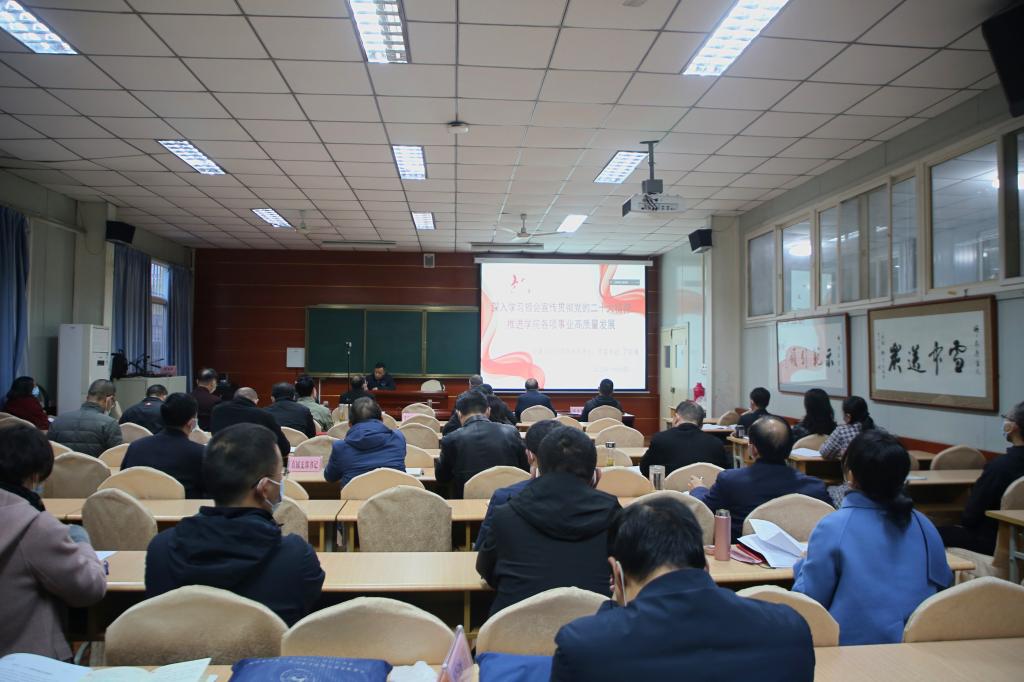 党委副书记、校长钟生海就贯彻落实会议精神,提出三点要求。一是高度重视,充分认识重大意义和核心要义。充分认识学习宣传贯彻党的二十大精神的重大意义,全面准确学习领会宣传贯彻党的二十大精神的核心要义。要切实把深入学习宣传贯彻党的二十大精神作为当前和今后一个时期的首要政治任务来抓。二是马上行动,掀起学习宣讲的热潮。会后,党委宣传部要拿出具体的宣讲安排,开展宣讲培训,宣讲团成员要积极承领任务,将党的二十大精神准确、全面、及时的宣传到每一位师生,做到“全覆盖”。三是学用结合,贯彻大会精神推动工作落实。学习领会党的二十大精神,进一步增强政治自觉、思想自觉、行动自觉,切实把党的二十大精神落实到学校工作各方面、全过程,推动学校各项事业高质量发展。