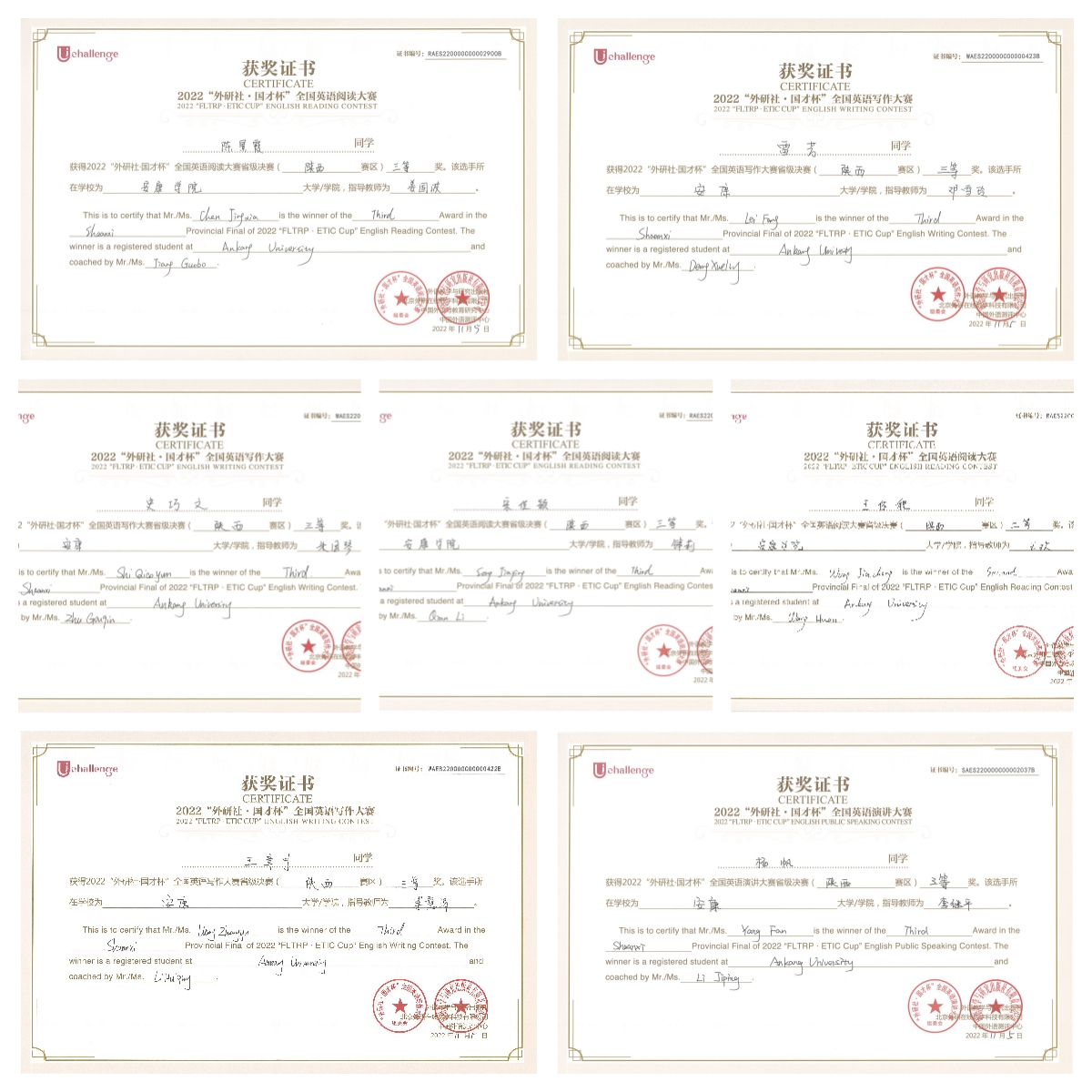 近日,2022年“外研社·国才杯”全国英语写作大赛、演讲大赛、阅读大赛”陕西赛区复赛顺利落下帷幕。经过激烈角逐,best365官网学子在全省高校420名选手中脱颖而出,获得阅读大赛二等奖1项、三等奖2项,演讲大赛三等奖1项,写作大赛三等奖3项的好成绩。