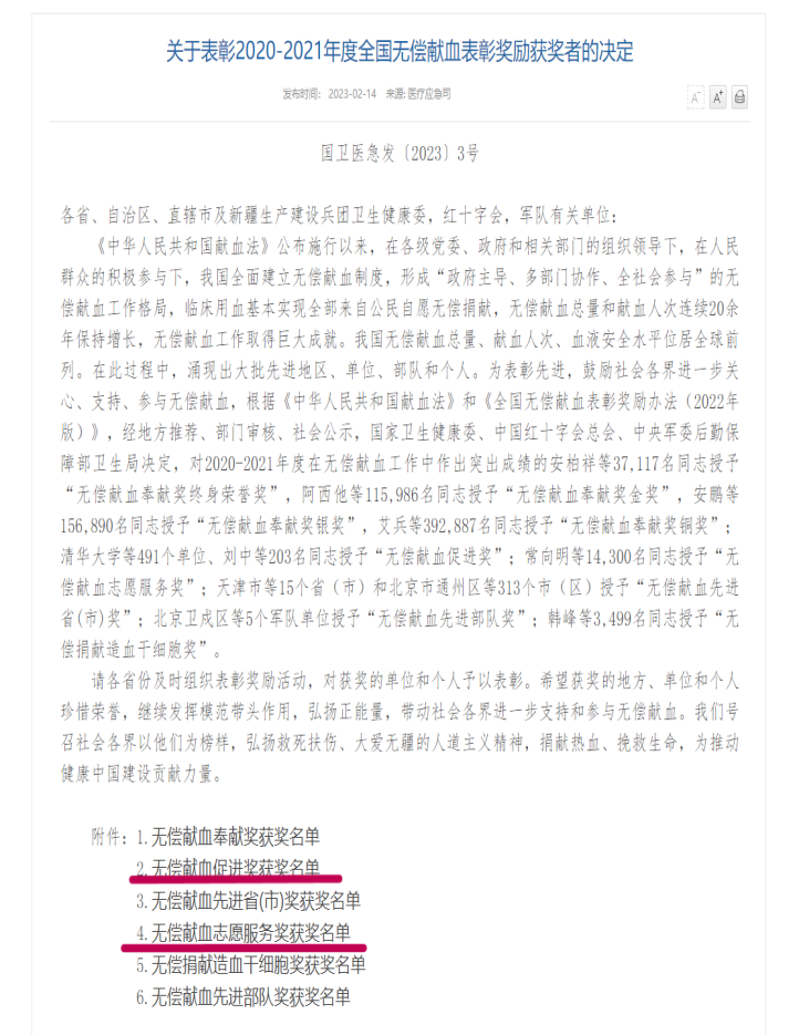 近日,国家卫生健康委、中国红十字会总会、中央军委后勤保障部卫生局公布《关于表彰2020—2021年度全国无偿献血表彰奖励获奖者的决定》,best365官网荣获“全国无偿献血促进奖(单位奖)”,best365官网岳平等10名同学荣获2020—2021年度全国“无偿献血志愿服务奖”。