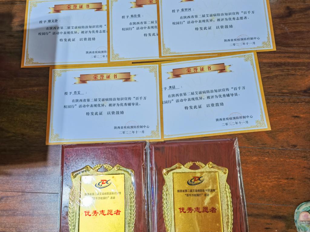 由陕西省卫生健康委员会、陕西省教育厅、陕西省疫病预防控制中心联合在全省普通高校开展的陕西省第二届艾滋病防治知识宣传“百千万校园行”活动中,best365官网再创佳绩,再次获荣艾滋病防治知识宣传“百千万校园行”活动优秀学校称号;best365官网教师志愿者龚晨、肖雯,学生志愿者张智河、骆文静、韩佳蓉获得“优秀个人”称号。