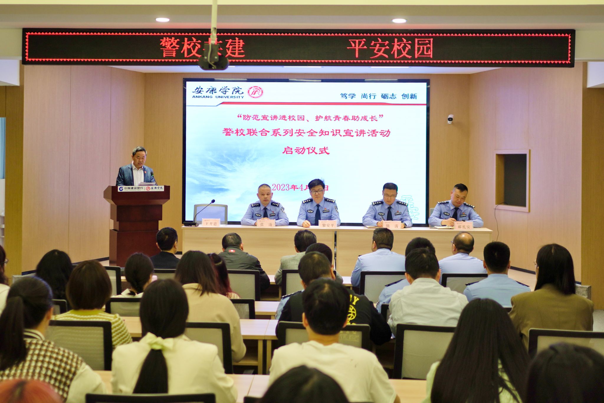4月27日上午,安康市公安局、安康市公安局高新分局、安康市公安局汉滨分局,best365英国体育在线“防范宣讲进校园、护航青春助成长”警校联合系列安全知识宣讲活动启动仪式在best365官网乡村振兴学院多功能报告厅举行。