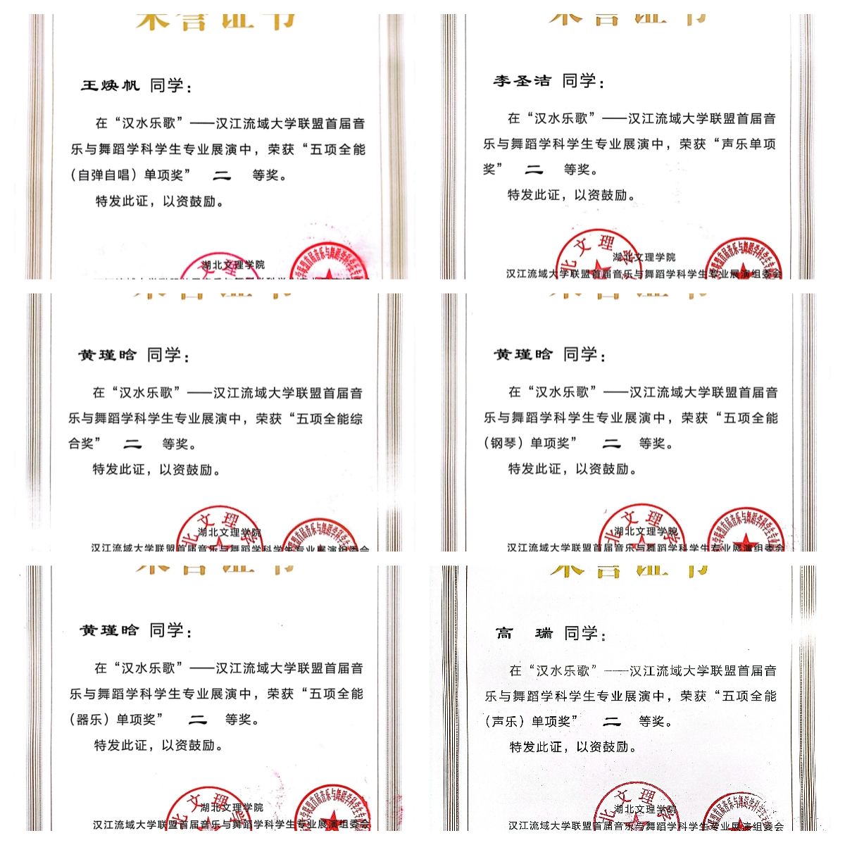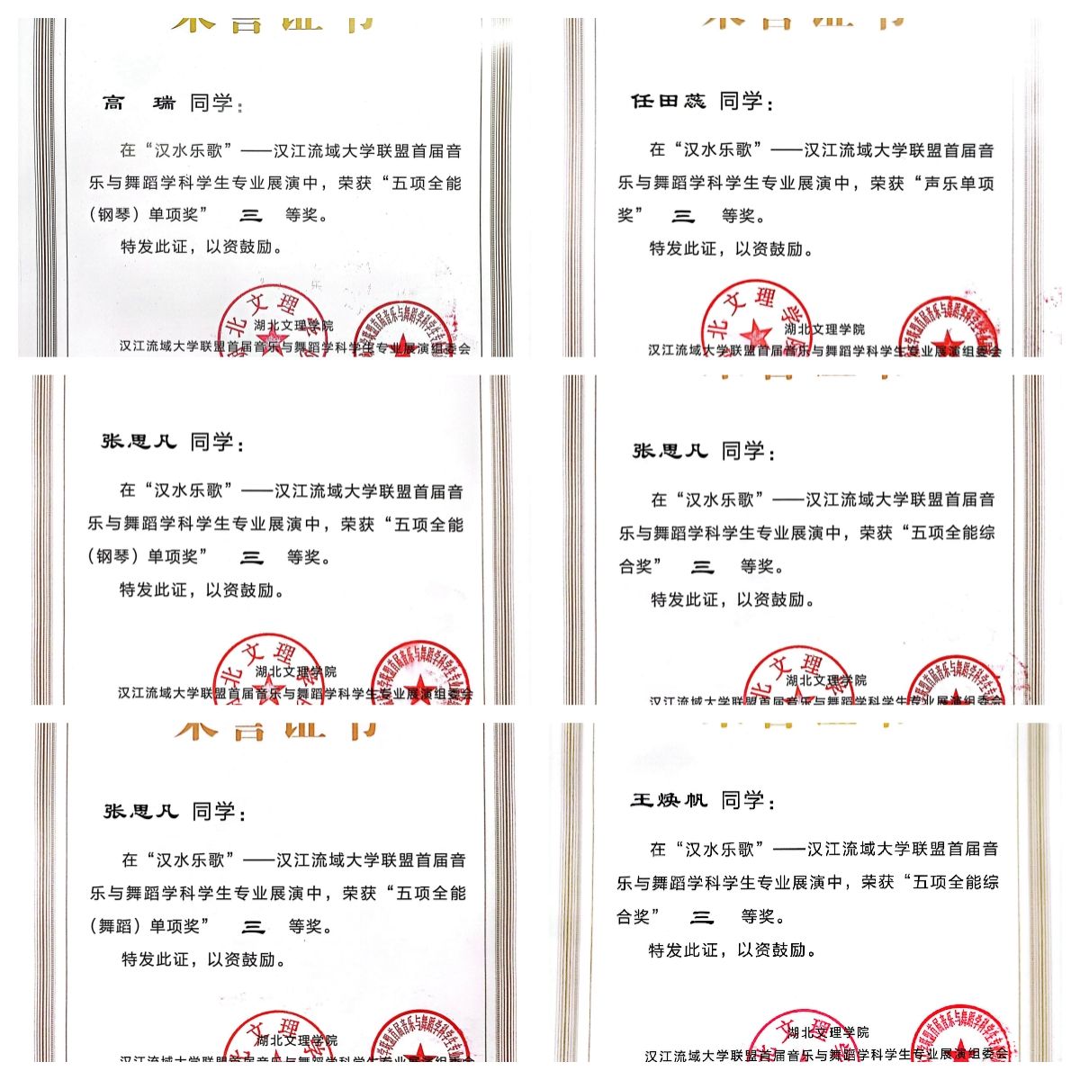 5月23日—26日,“汉水乐歌——汉江流域大学联盟首届音乐与舞蹈学科学生专业展演”活动在湖北文理学院举行。best365官网艺术学院音乐学专业学生在此次展演中取得佳绩,共获得五项全能综合奖一等奖1项、二等奖1项、三等奖2项,自弹自唱一等奖1项、二等奖1项,钢琴单项二等奖1项、三等奖2项,器乐单项二等奖1项,舞蹈单项三等奖1,声乐单项二等奖2项,三等奖1项等14项奖项,充分展现了best365官网音乐学专业的学生专业技能和办学质量。
