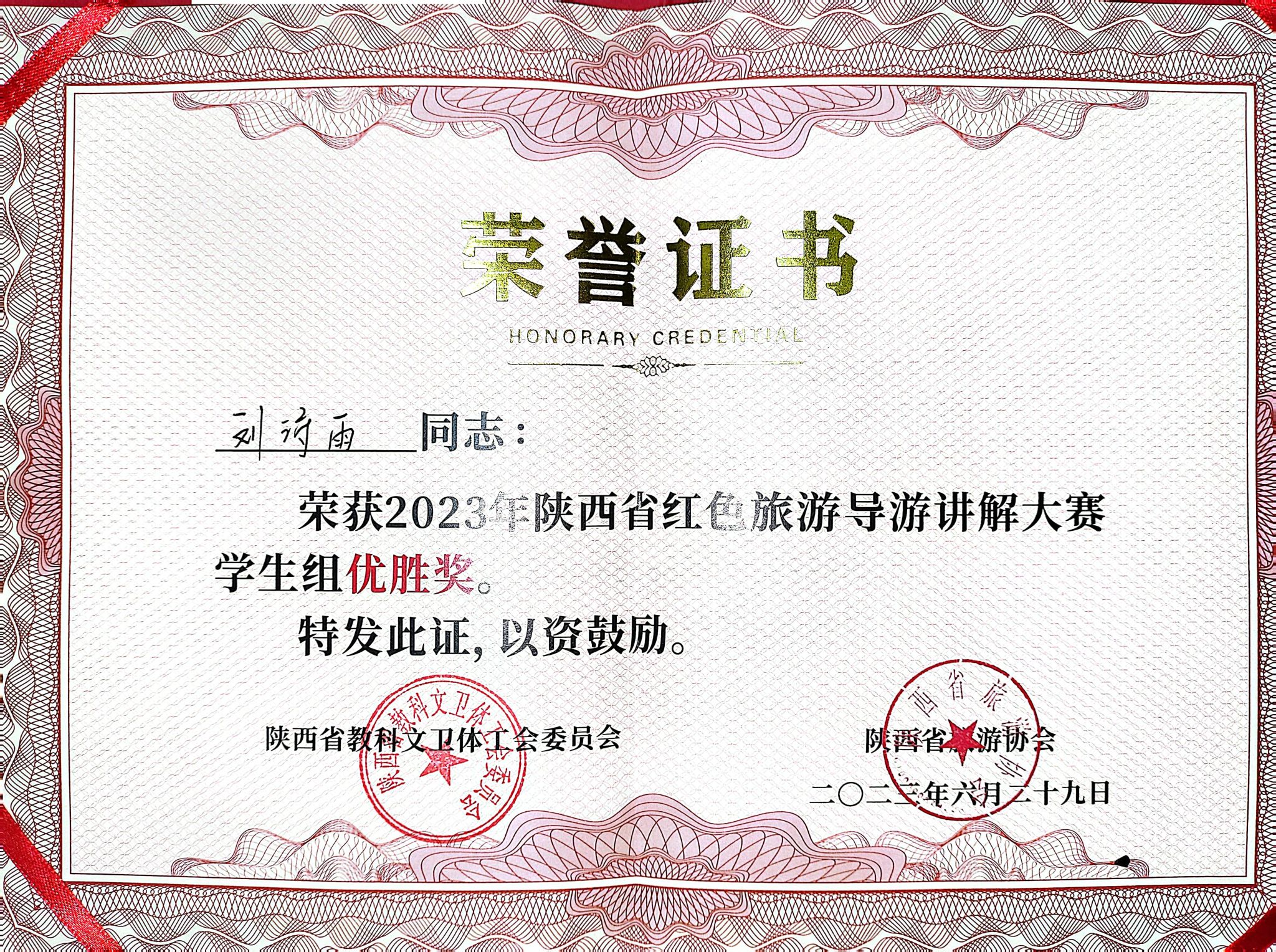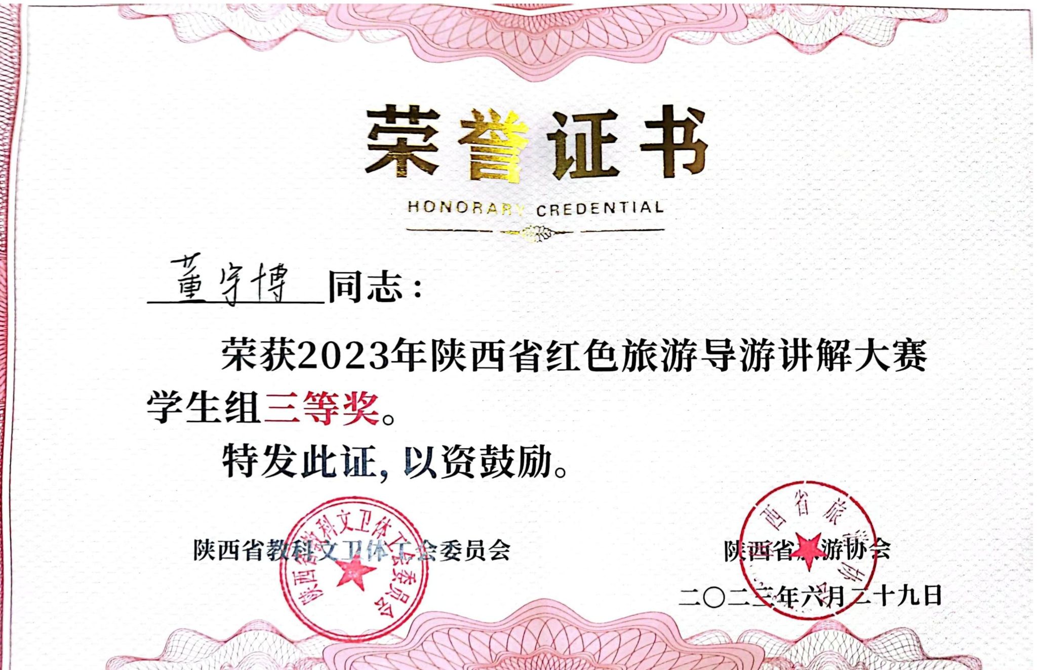 6月30日,由陕西省教科文卫体工会委员会和陕西省旅游协会主办的2023年“陕西红色旅游讲解大赛”在陕西省职业技术学院白鹿原校区举行。best365官网旅环学院旅游管理2020级1班董宇博、刘诗雨两名学生分获三等奖、优秀奖各1项,旅游与资源环境学院获优秀组织单位奖。