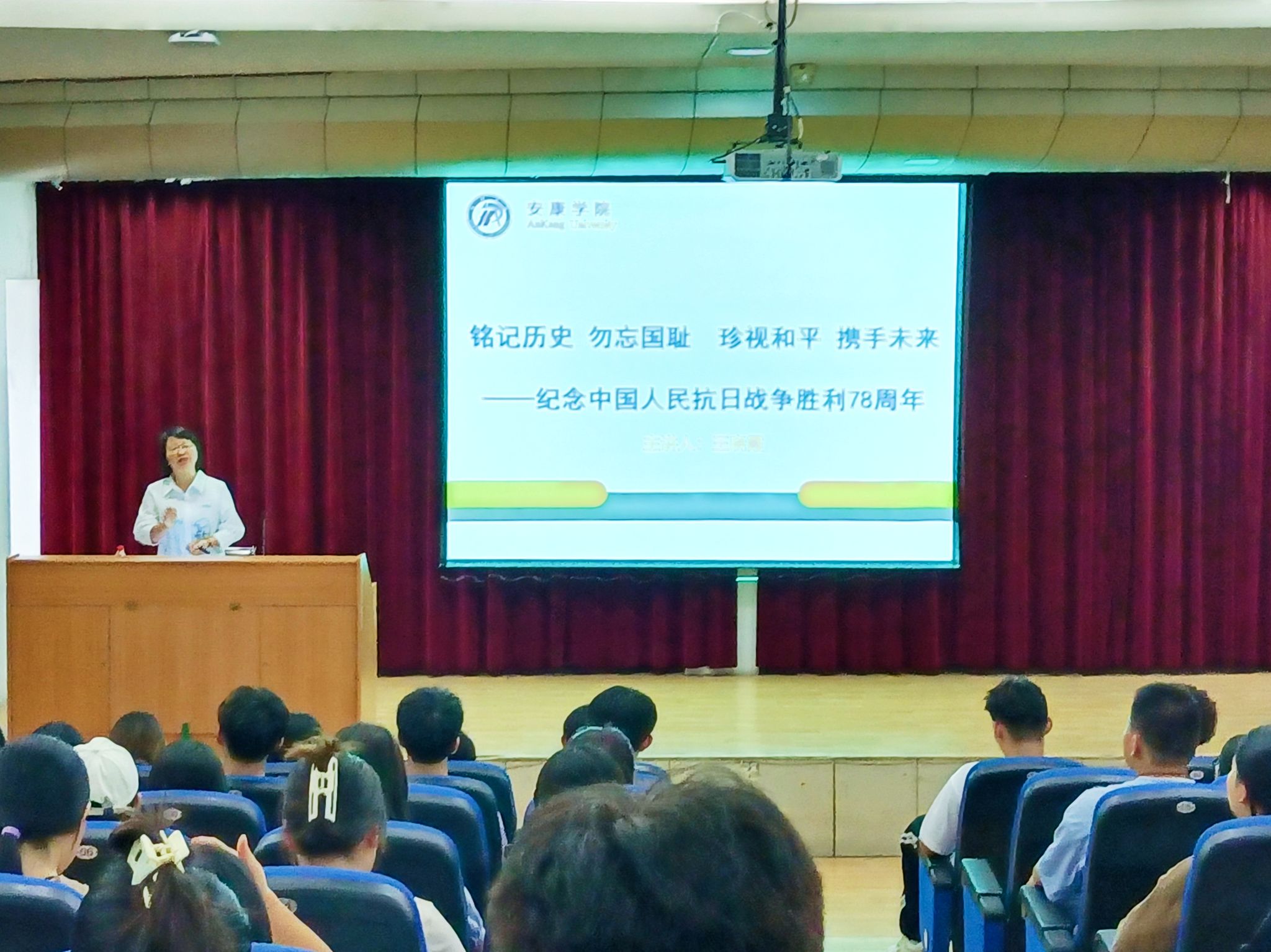 活动在庄严的国歌声中正式开始。王晓霞以《铭记历史 勿忘国耻 珍视和平 携手未来》为主题,为师生介绍了中国人民抗日战争的历史意义,并带领师生回顾了日军无差别轰炸安康及造成的巨大损失和由此带给我们的反思。